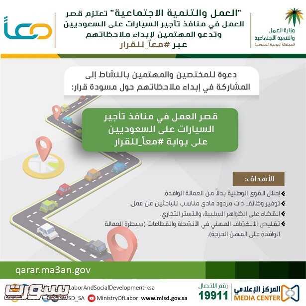 العمل والتنمية الاجتماعية تجدد دعوتها لإبداء الرأي في قصر العمل على السعوديين في منافذ تأجير السيارات عبر بوابة معا صحيفة سبورت السعودية